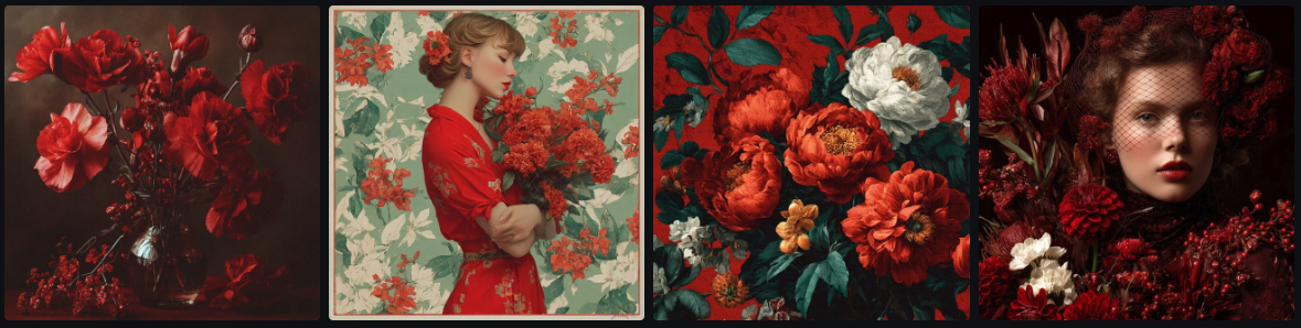 The first gives you vintage-style flowers that happen to be red. The second gives you flowers in a "red vintage" style (think faded communist poster aesthetic).